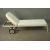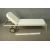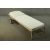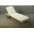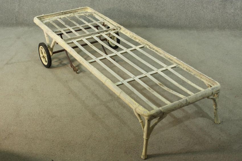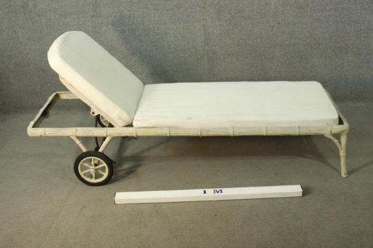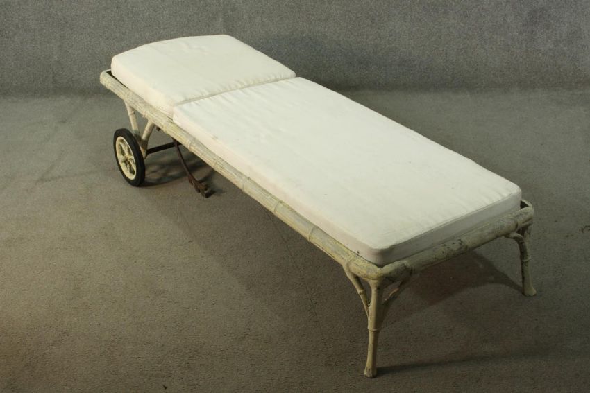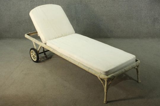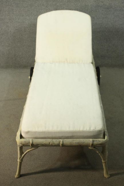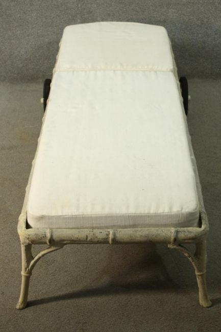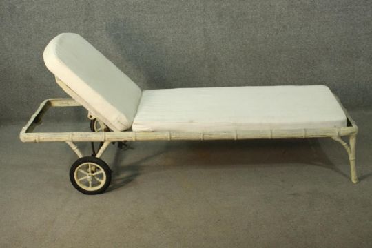 A white painted cast iron garden lounger, with white upholstered cushions, the faux bamboo frame with a rising back support, on two wheels and two faux bamboo legs. L.180cm.