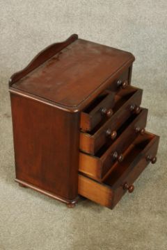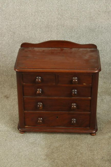 A 19th century mahogany apprentices chest of two short over three graduating drawers with turned knob handles raised on bun feet. H.39 W.39 D.23cm.