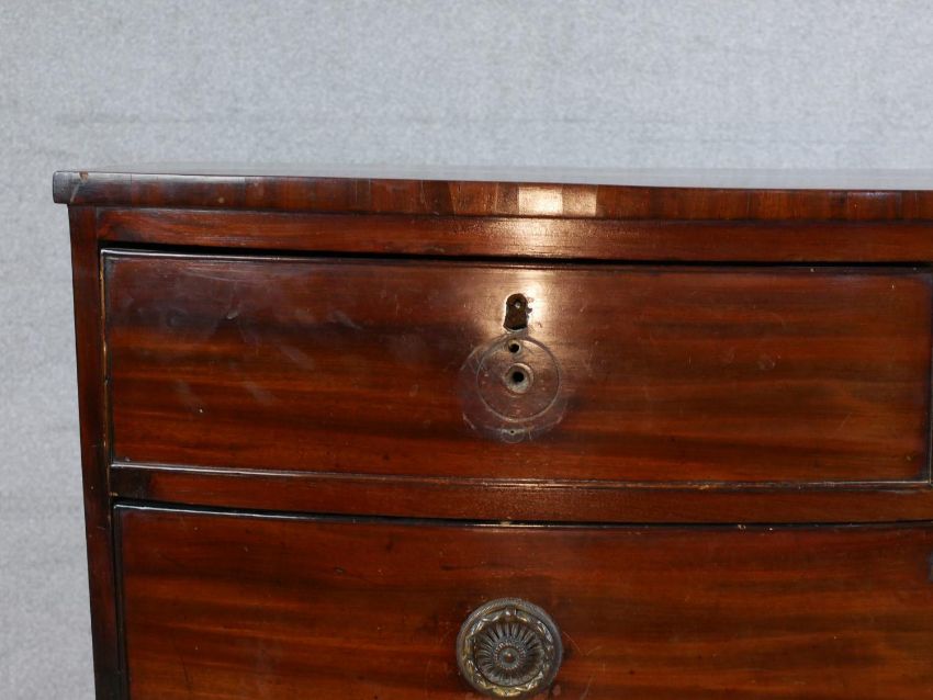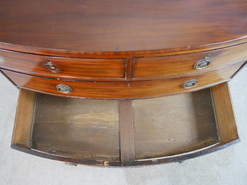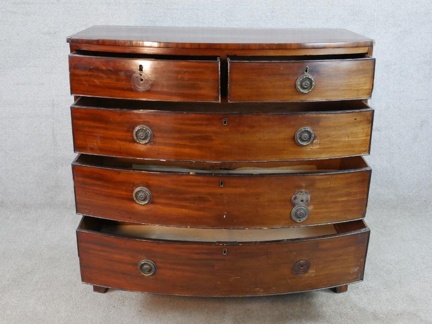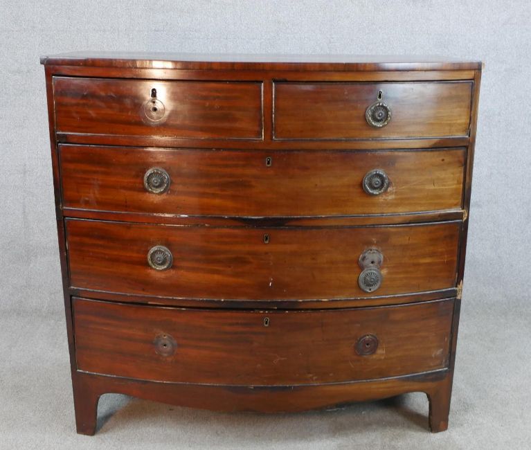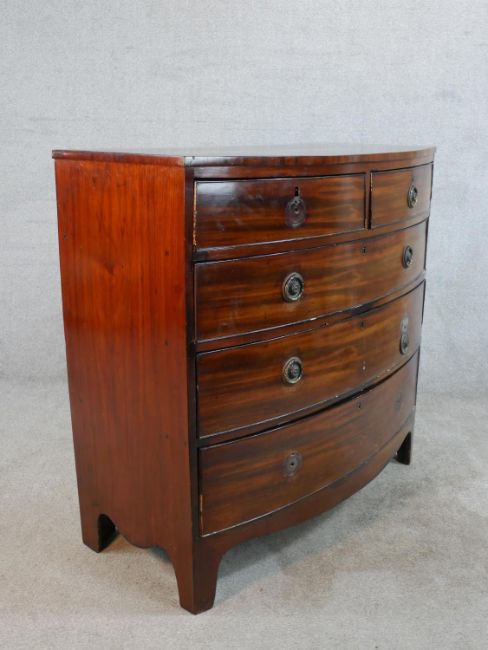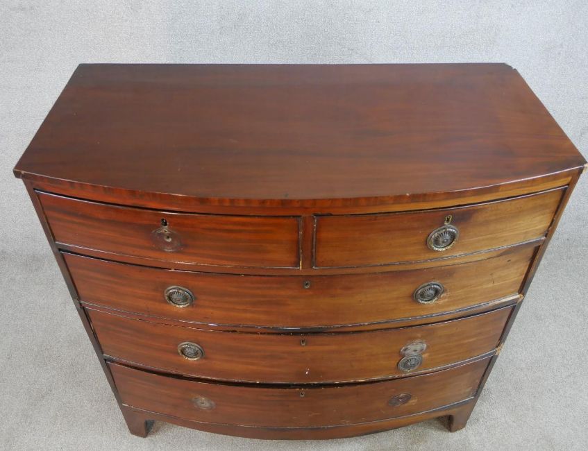 A 19th century mahogany bow fronted chest of two short over three long drawers, raised on shaped bracket feet. H.101 W.105 D.51cm