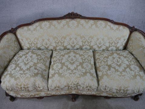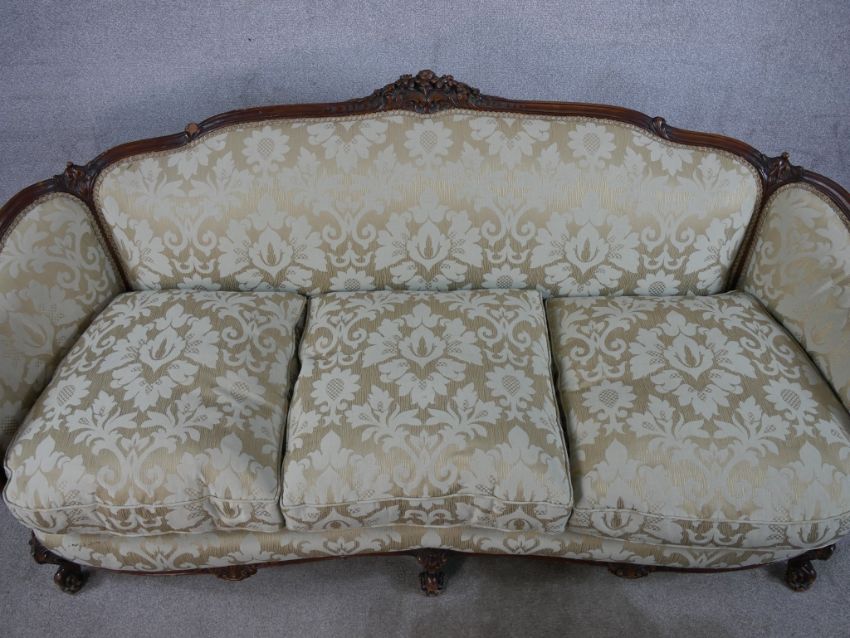 A late 19th/early 20th century carved French stained beech framed three seater settee, upholstered in cream damask fabric raised on carved supports with scroll feet. H.86 W.194 D.90cm