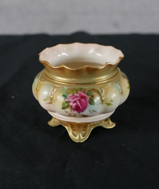 Four pieces of English porcelain comprising of a Royal Crown Derby Imari porcelain miniature vase, a small early 20th century Royal Worcester vase decorated with roses, shape number 220 and date code for 1902, an early 20th century Royal Worcester blush ivory censer and a Royal Stafford miniature porcelain tankard decorated with flowers. H.6 W.11 D.11 Largest