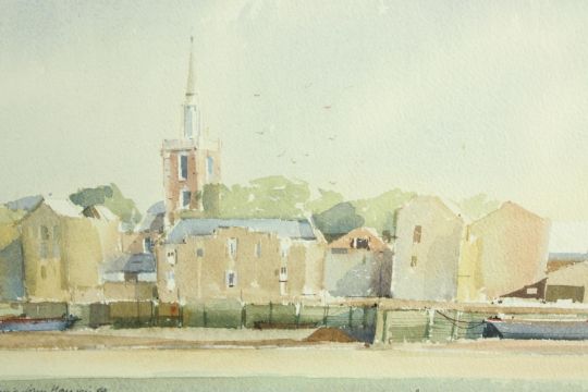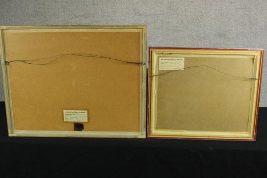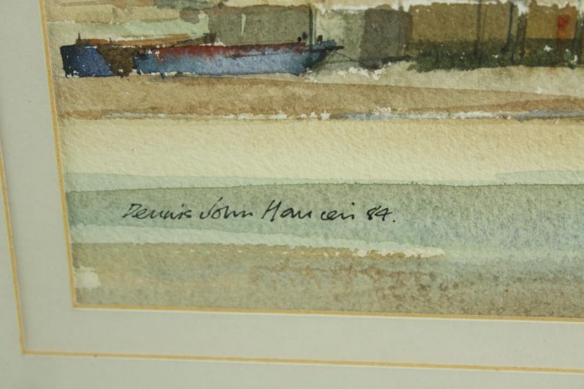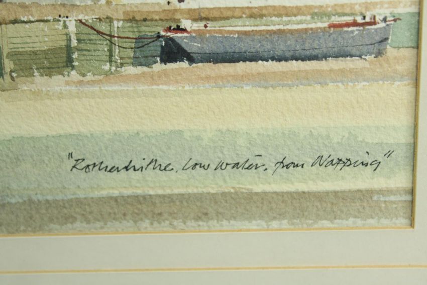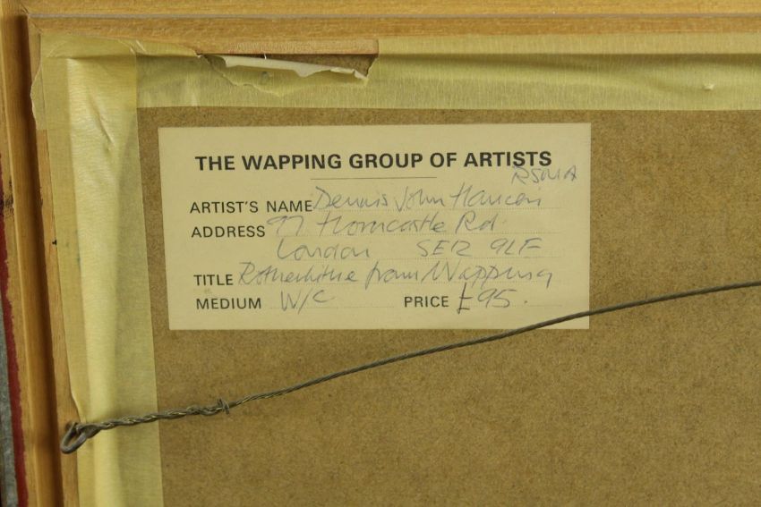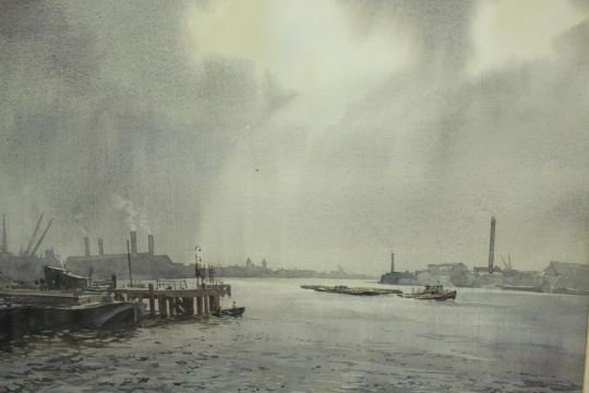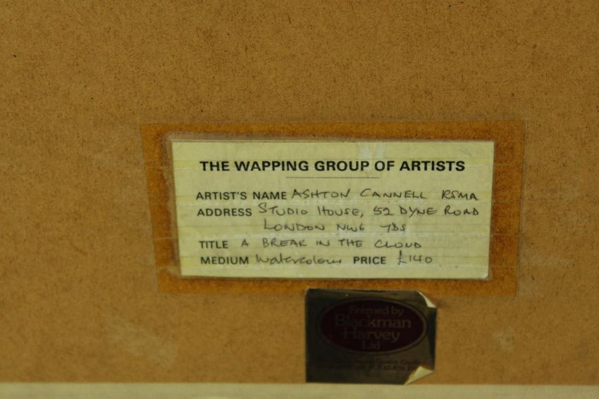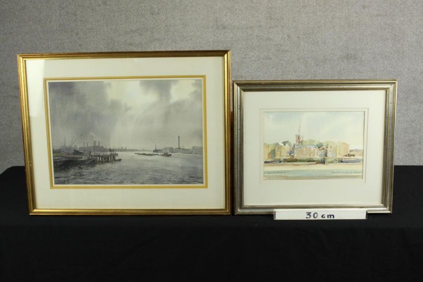 Aston Canell (1927-1994) A Break in the Cloud, sun over the River Thames, watercolour on paper, signed and framed, together with Dennis John Hanceri (b.1928) Rotherhithe from Wapping, watercolour on paper, signed and framed, each with labels verso. Largest H.55 W.69cm.