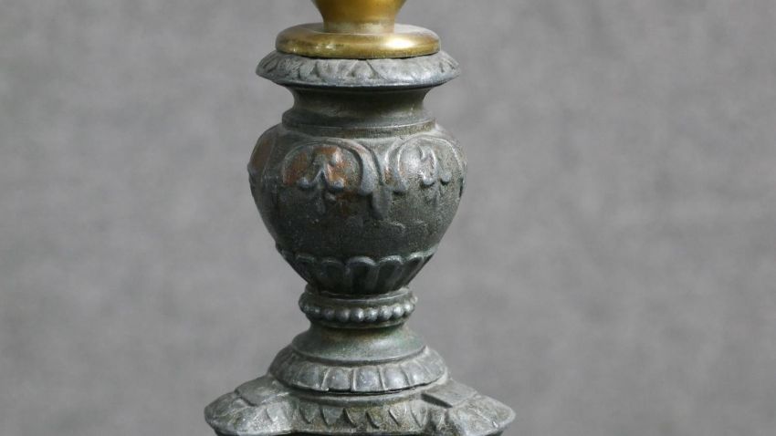 A classical column design brass table lamp with lion head motifs. H.25 W.19cm