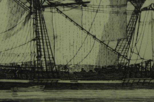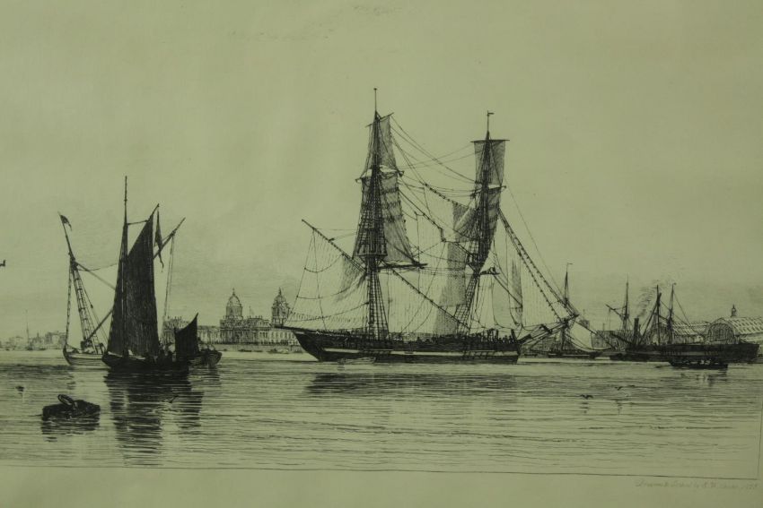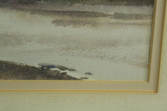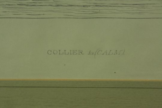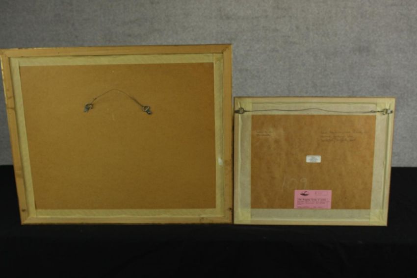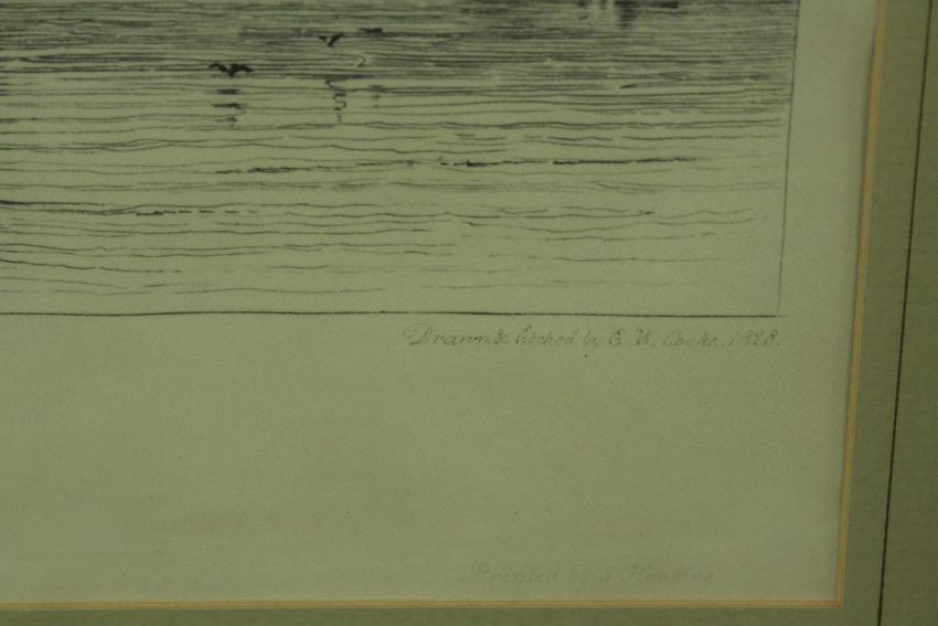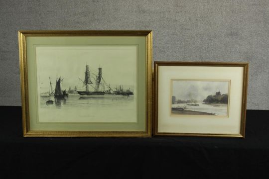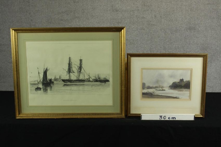 Trevor Chamberlain (b.1933), Birds in the Rain, watercolour on paper, signed and framed, together with a E.W. Cooke (19th century) Collier & Calm, etching on paper, framed. H.53 W.63cm. (largest)
