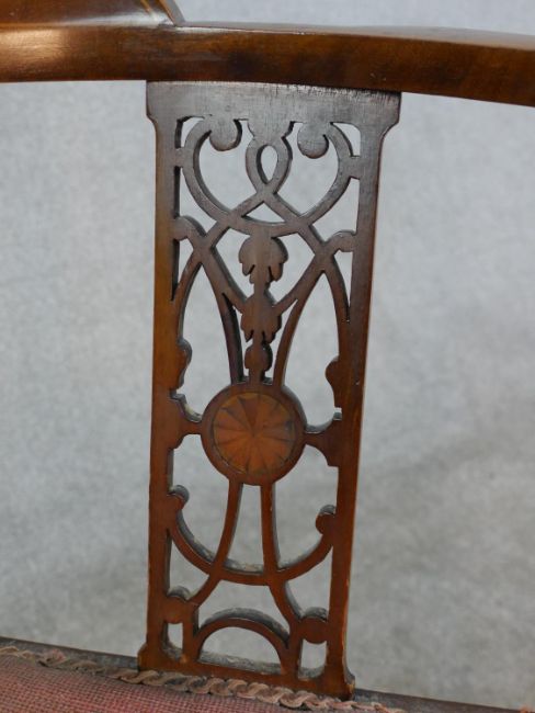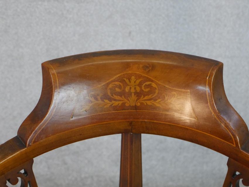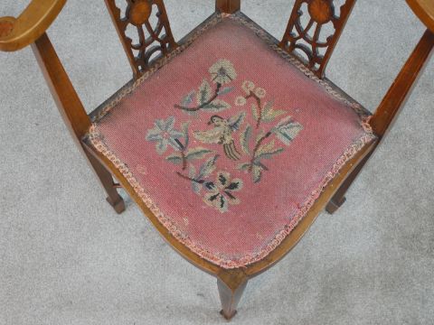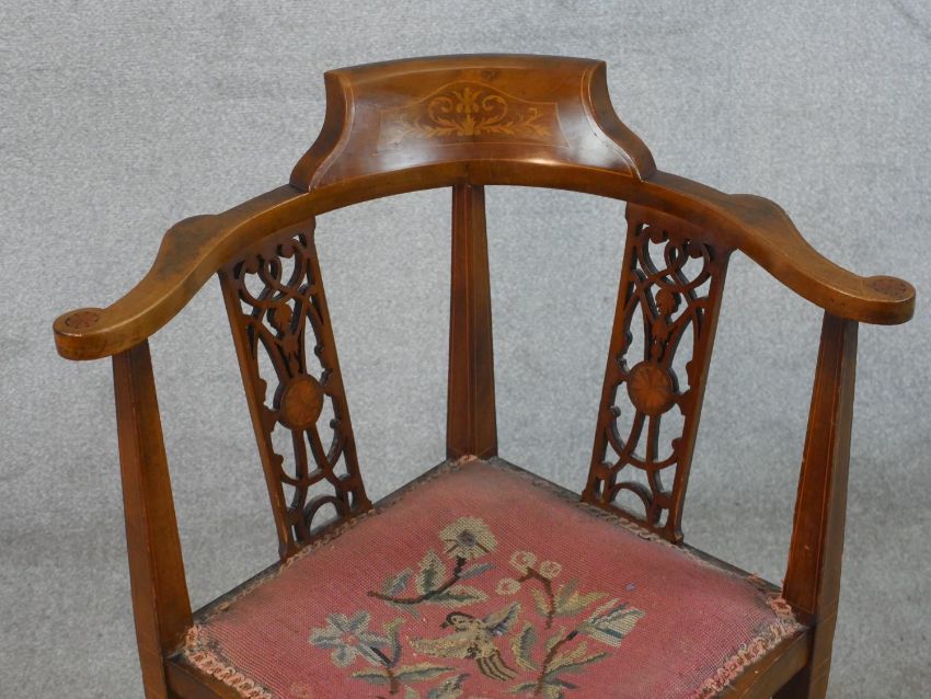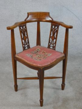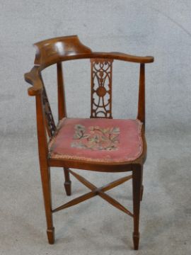 An Edwardian inlaid mahogany pierced splat back corner chair with embroidered seat, raised on X shaped stretcher and square tapering supports terminating on spade feet.