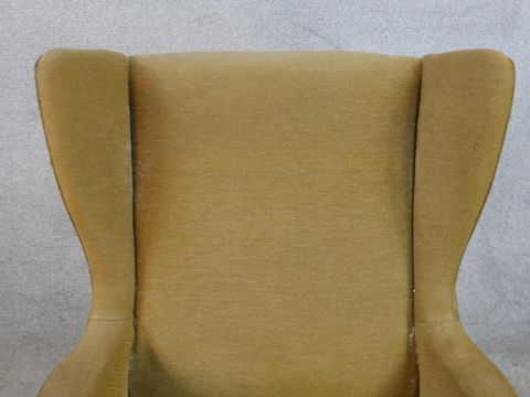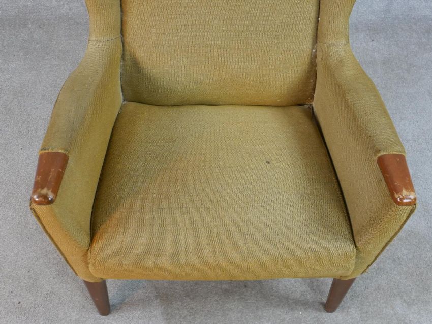 A mid 20th century teak framed upholstered wing back armchair, raised on tapering supports.
