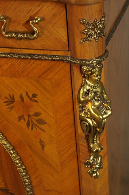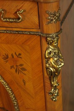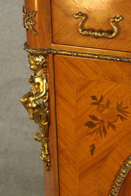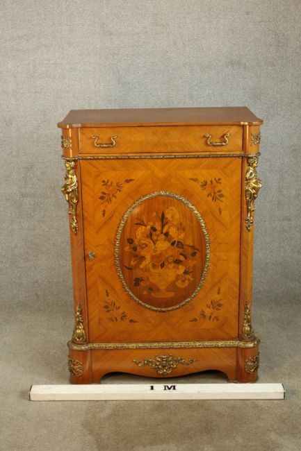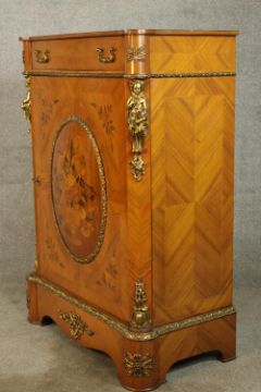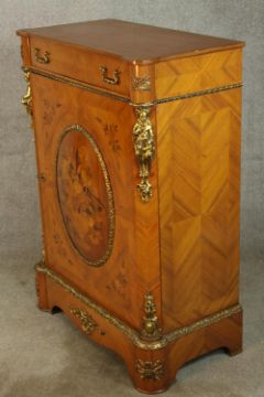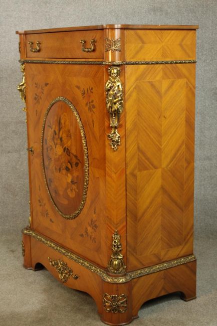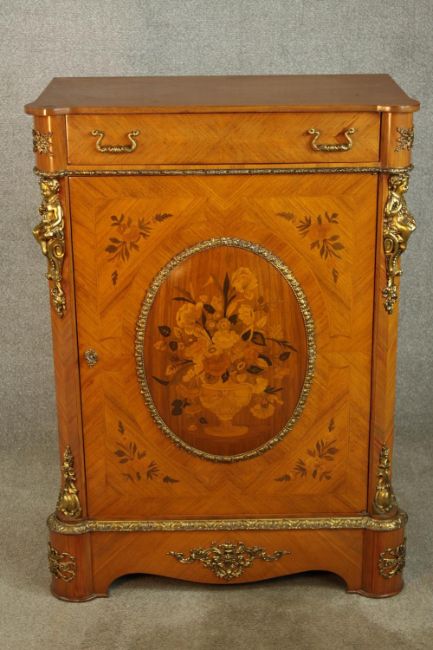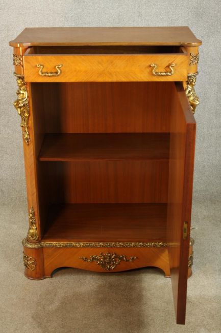 An 20th century French inlaid single door cabinet raised on shaped bracket feet, applied with gilt metal mounts, with single drawer above the door opening to reveal three shelves. H.107 W.92 D.28cm.