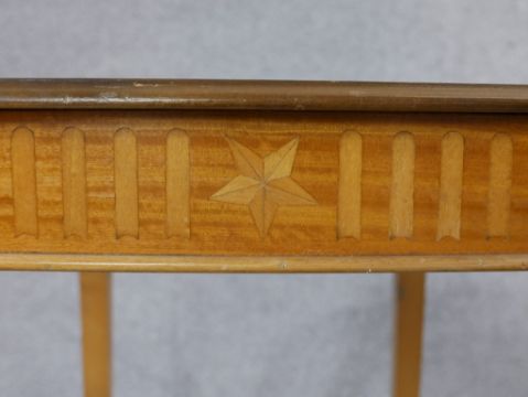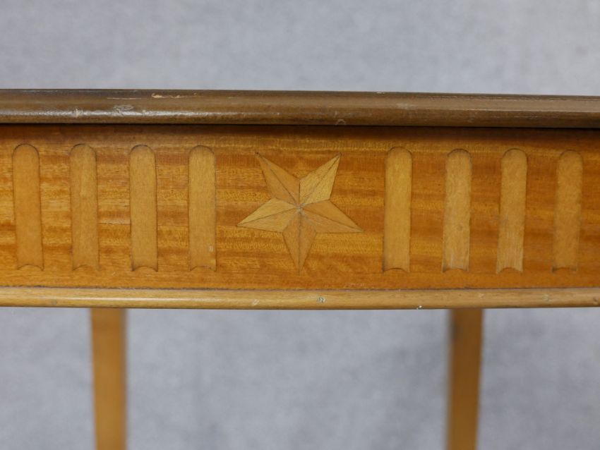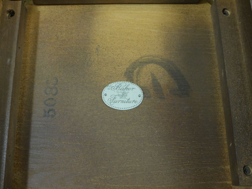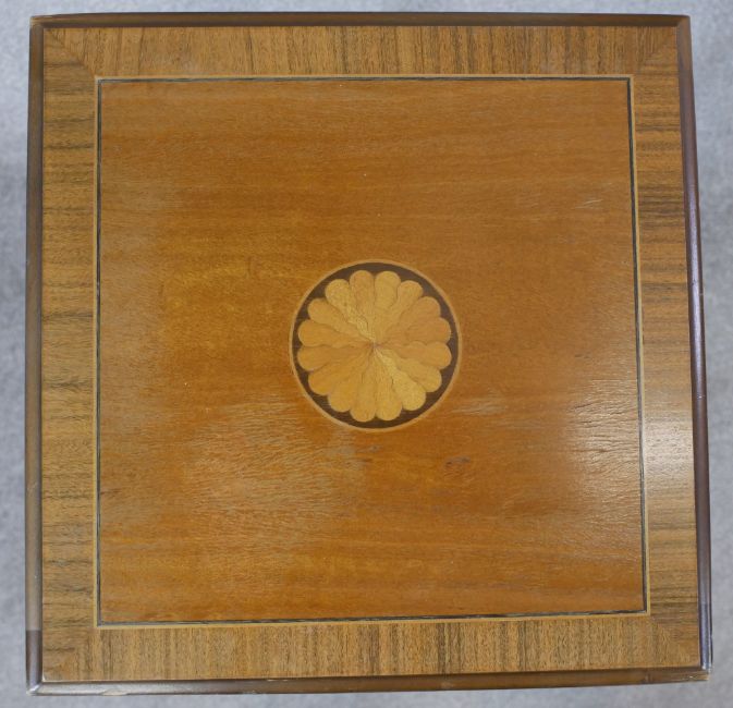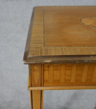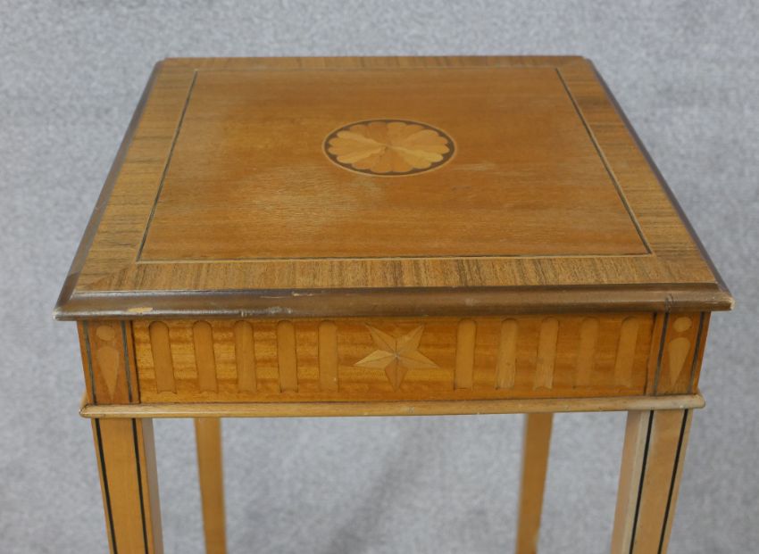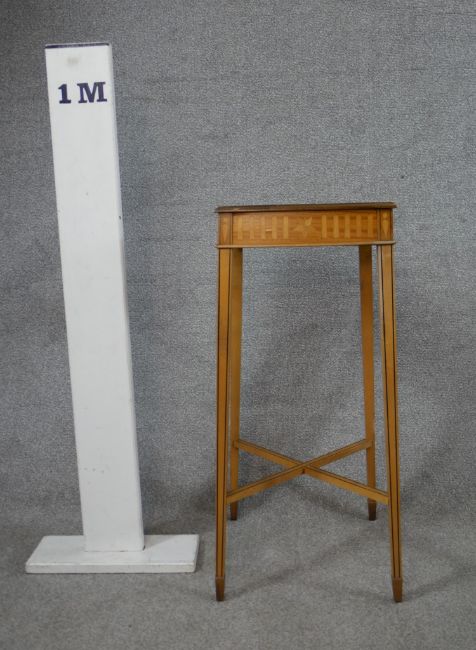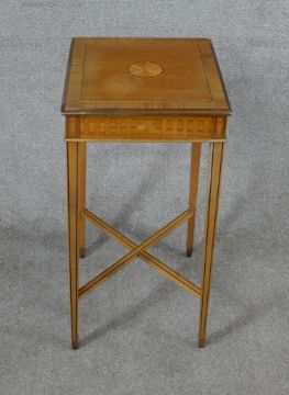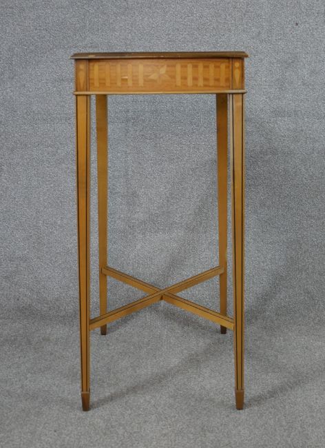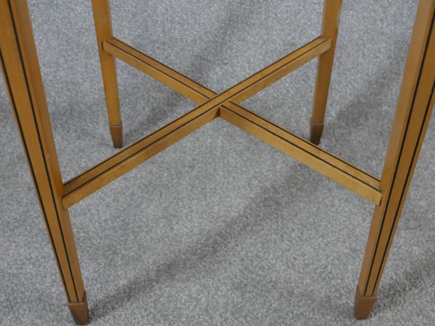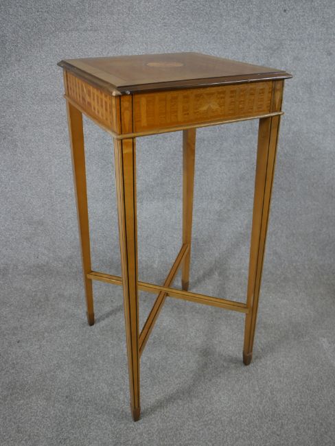 An Edwardian style Baker Furniture inlaid satinwood square topped lamp table raised on tapering supports terminating in spade feet united by 'X' stretcher. H.70 W.30 D.30cm