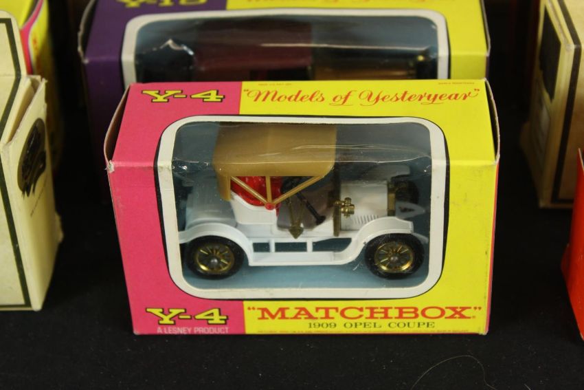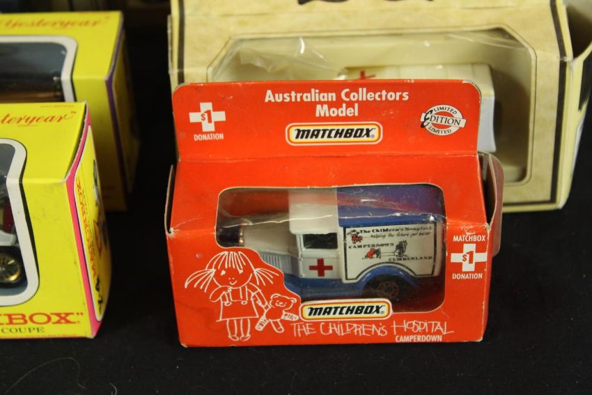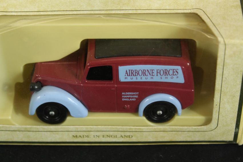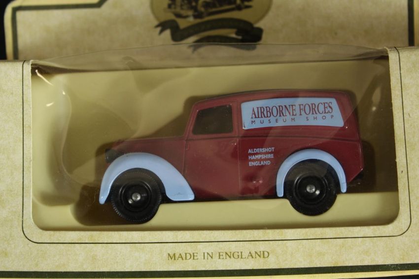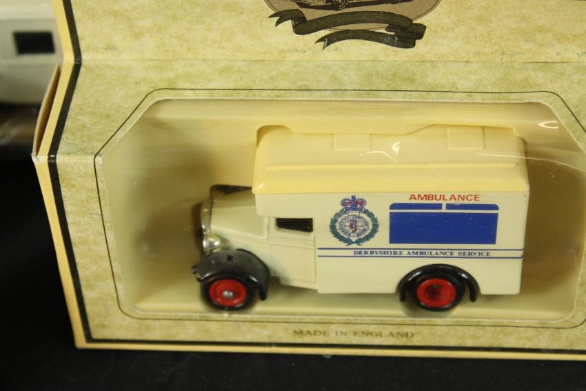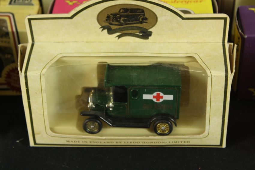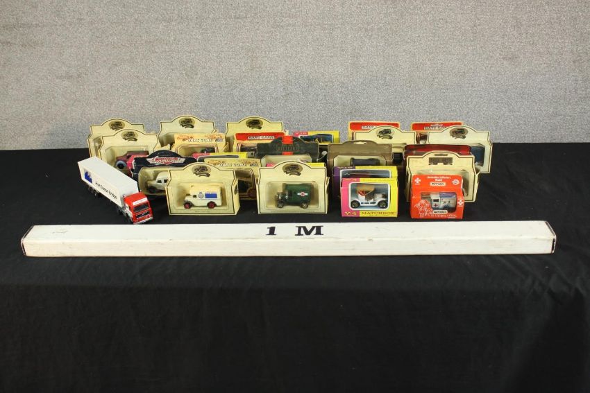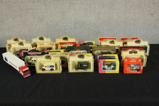 Assortment of boxed Lledo and Matchbox scale model vans. Collection of toy cars. H.7 W.25 D.5cm. (largest)