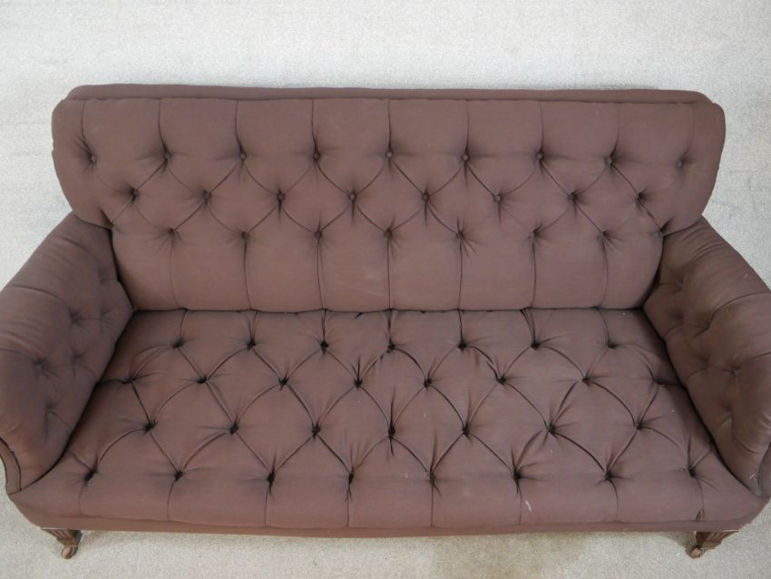 A late 19th century mahogany framed button upholstered scroll arm settee, raised on square tapering supports terminating in brass casters. H.91 W.200 D.100cm