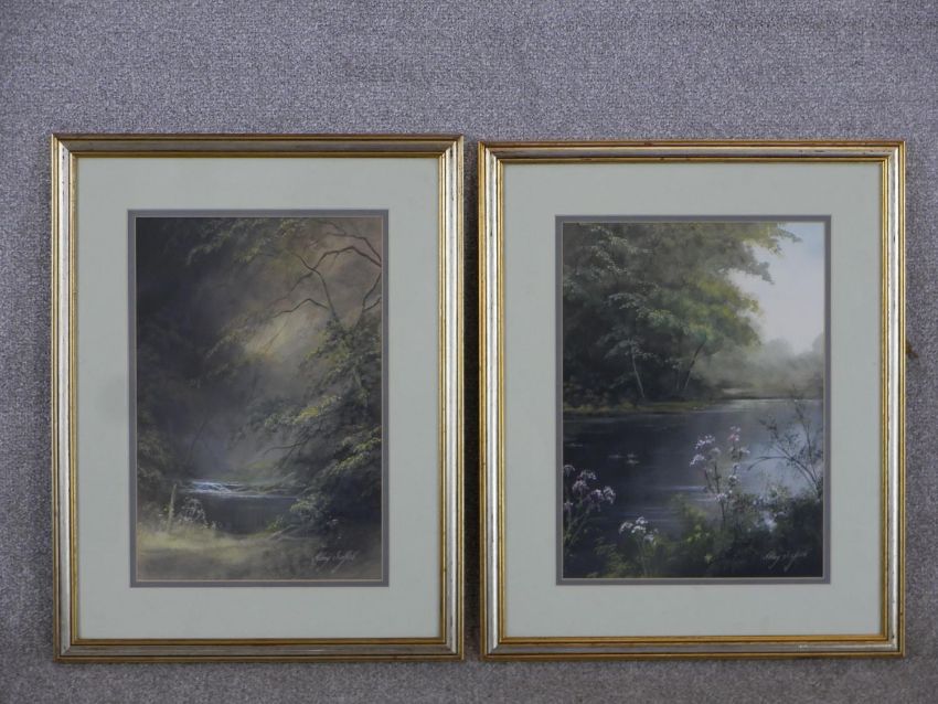Hilary Scoffield (b.1958, British), tree covered river, watercolour on paper, signed and framed, a pair. H.53 W.41cm. (each)