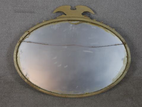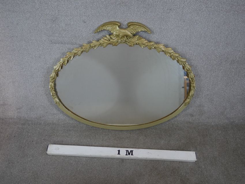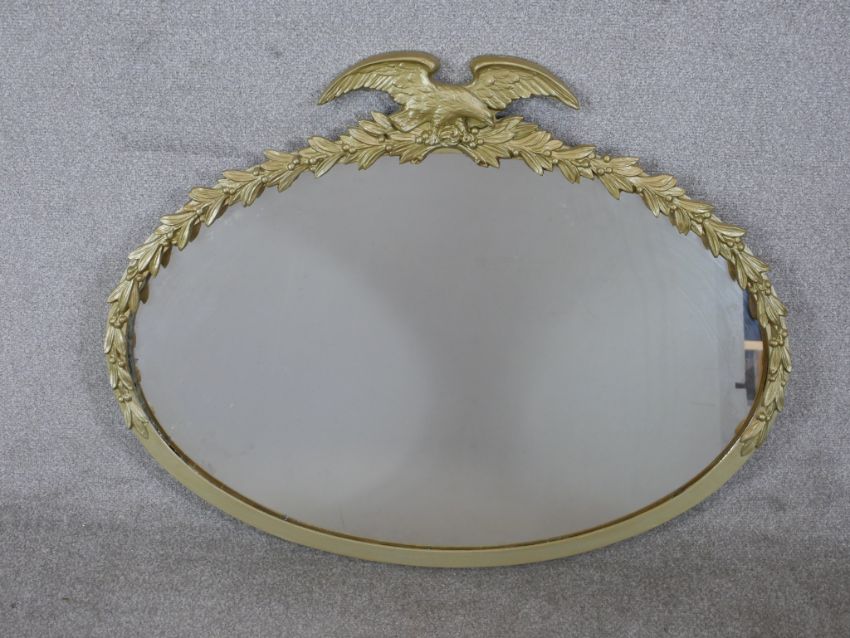 A 20th century oval gilt framed mirror mounted with leaf and eagle decoration. H.77 W.96cm