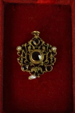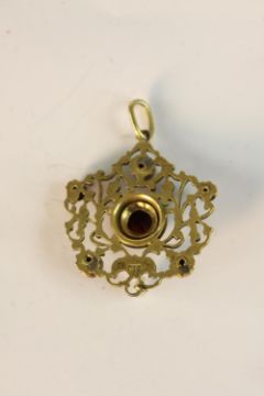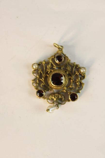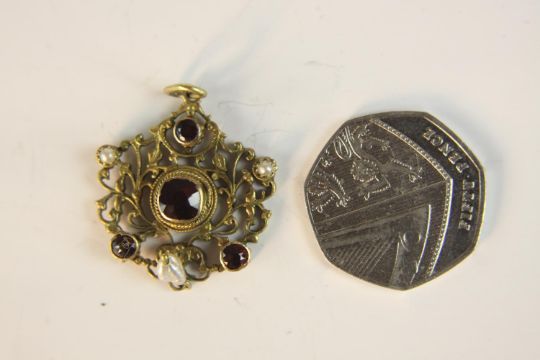 An early 20th century Austro-Hungarian gilt metal pierced foliate design pendant set with garnets and seed pearls with a baroque pearl hanging from the centre. H.9 W.5.5cm.