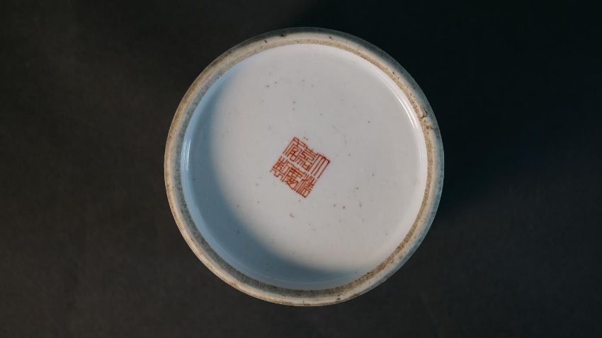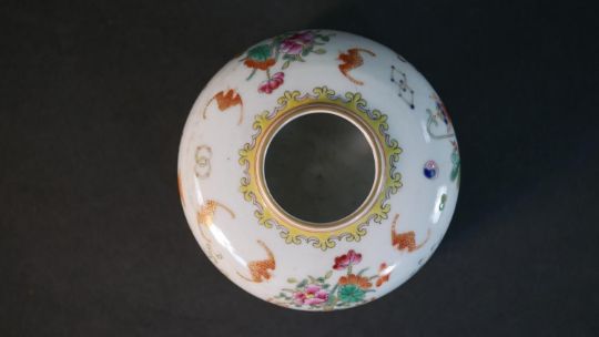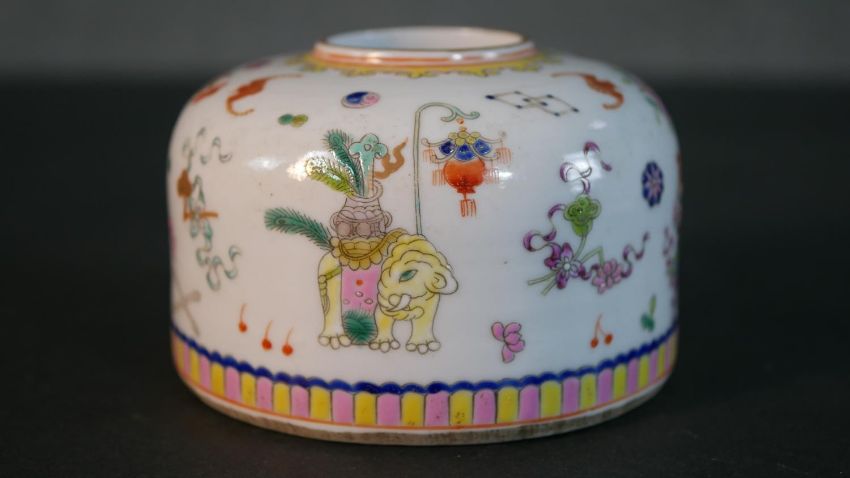 A 19th century hand painted Chinese DouCai porcelain brush washer decorated with flowers, elephants and vases. Jiaqing red seal mark to base. H.6 Diam.9.5cm