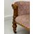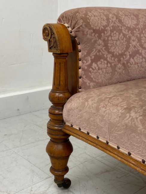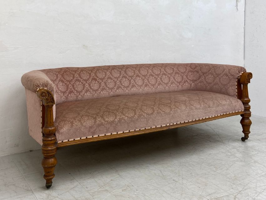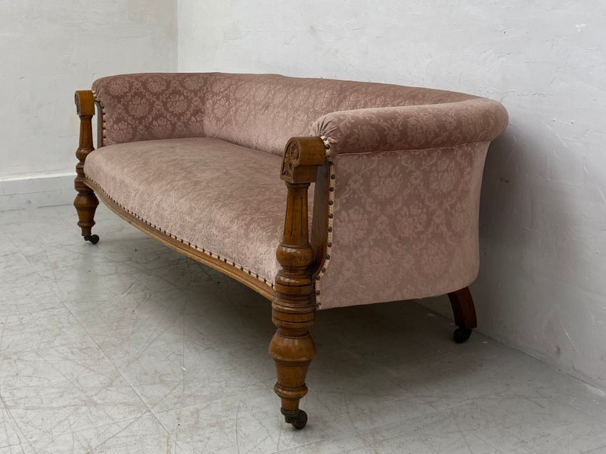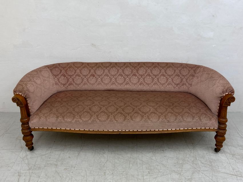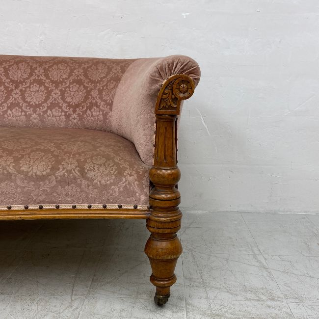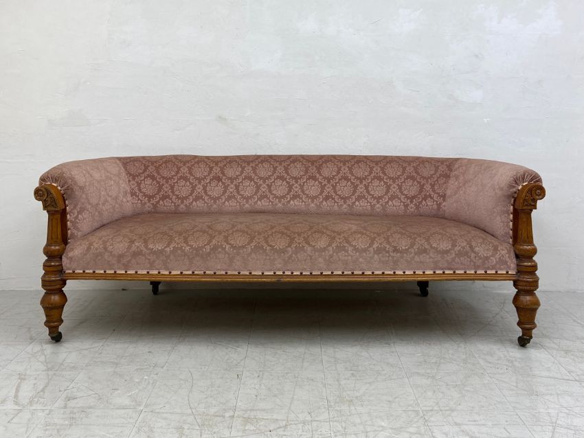A mid 19th century oak sofa re-upholstered in foliate dusty pink raised on turned and carved supports resting on brass castors. H.75 W.214 D.76cm