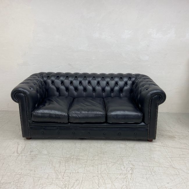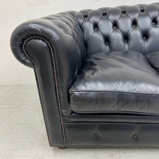 A black leather three seater Chesterfield sofa having a scrolled deep button back and arms over a cushioned seat raised on short circular feet. L.208cm