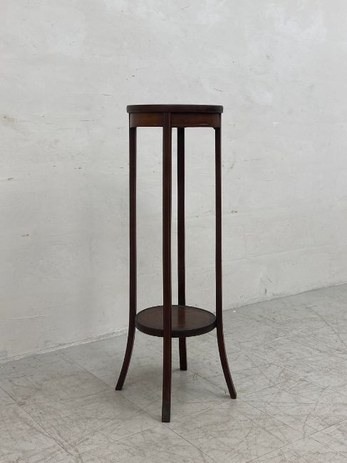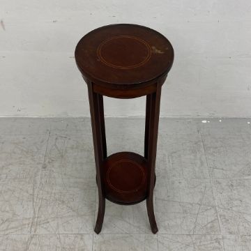 A C.1900 mahogany plant stand having a circular satinwood inlaid top raised on four flat splayed supports united by an undertier. H.38 Dia.12.5cm