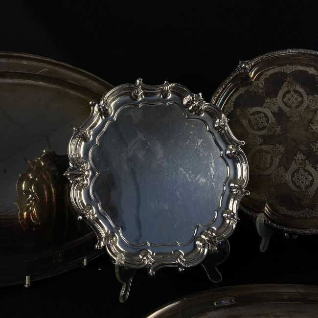 Collection of silver plated trays and salvers and a shell form comport, Elkington, Walker and Hall etc. W.46cm