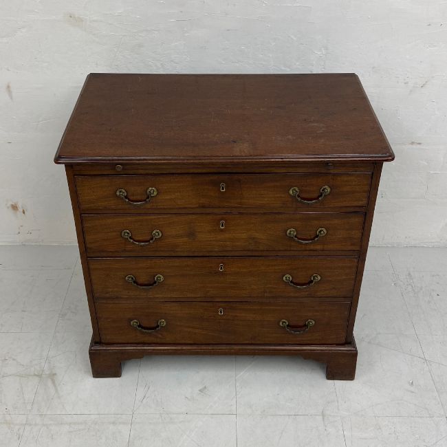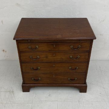 A Georgian mahogany bachelor's chest of small proportions having a thumb-moulded top with brushing slide over four graduating drawers with brass handles raised on shaped bracket supports. H.81 W.81 D.cm