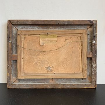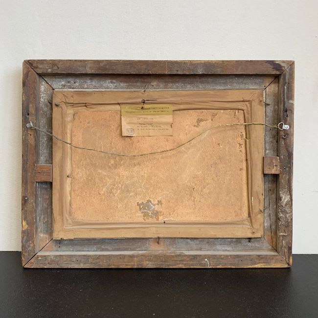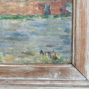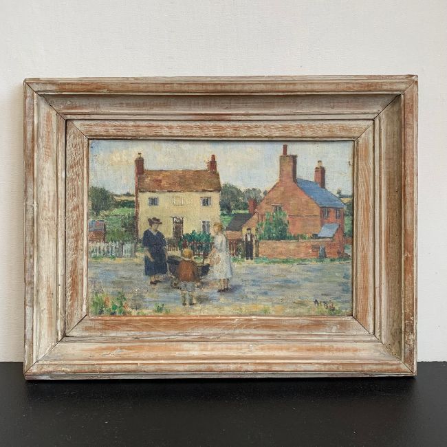 A 20th century Impressionist style oil on canvas laid board depicting four figures in a rural setting, signed to the lower right in a distressed frame. H.50.5 W.66cm