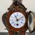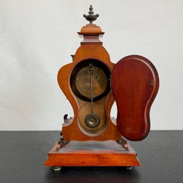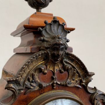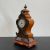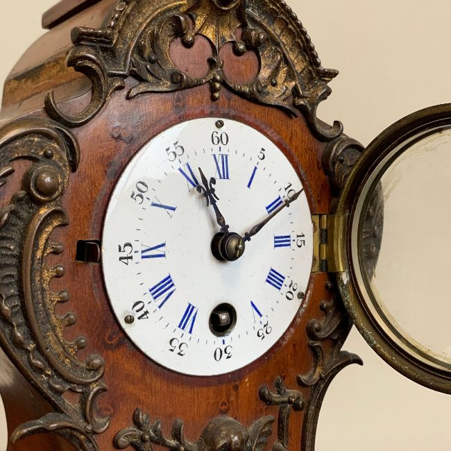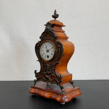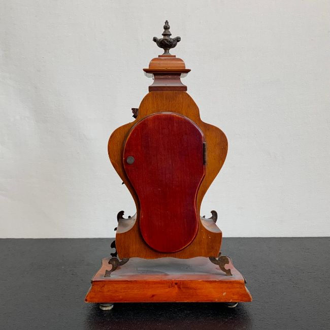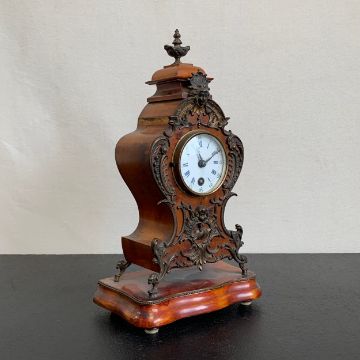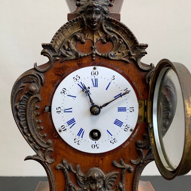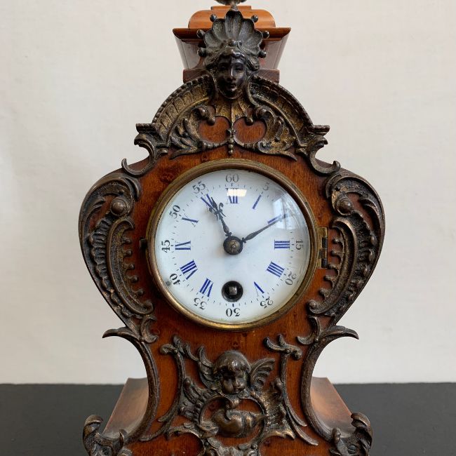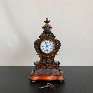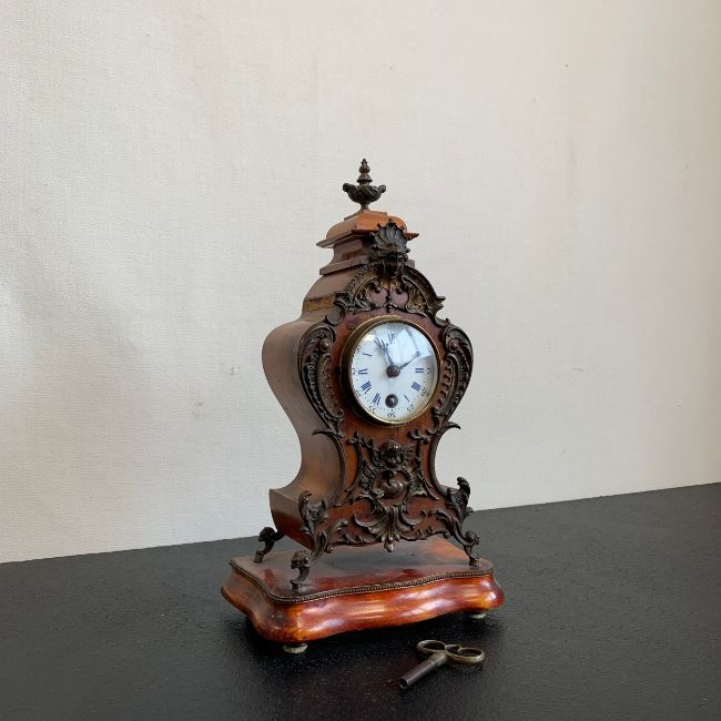 A 20th century gilt metal mounted French style walnut Lenzkirch mantle clock with urn finial and allover figural and scrolling foliate decoration over the shaped body with enamelled dial raised on a moulded plinth base (with key). H.35cm (clock)