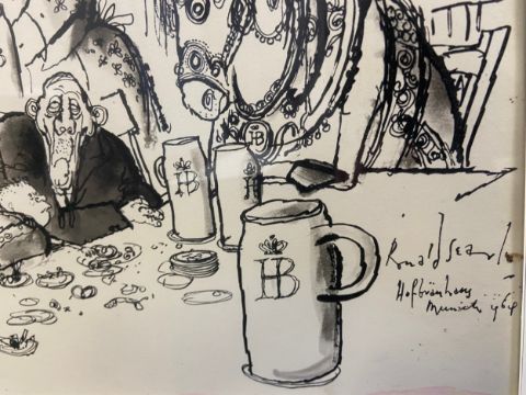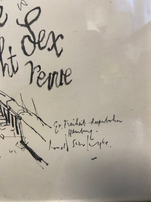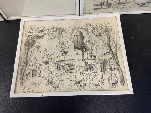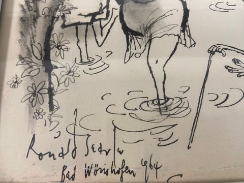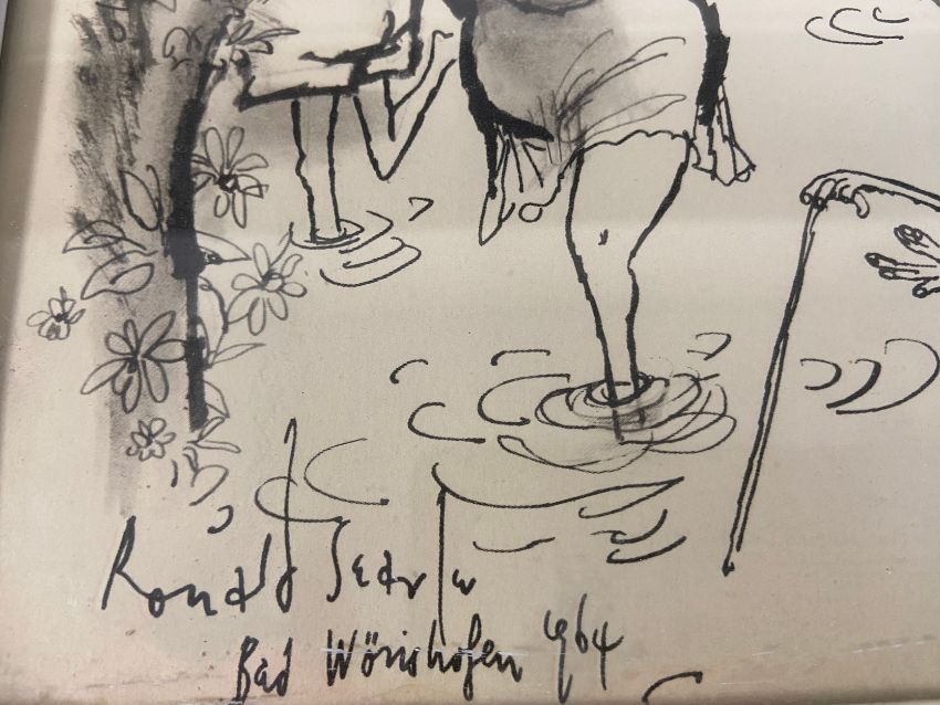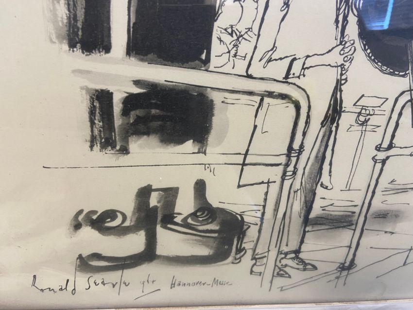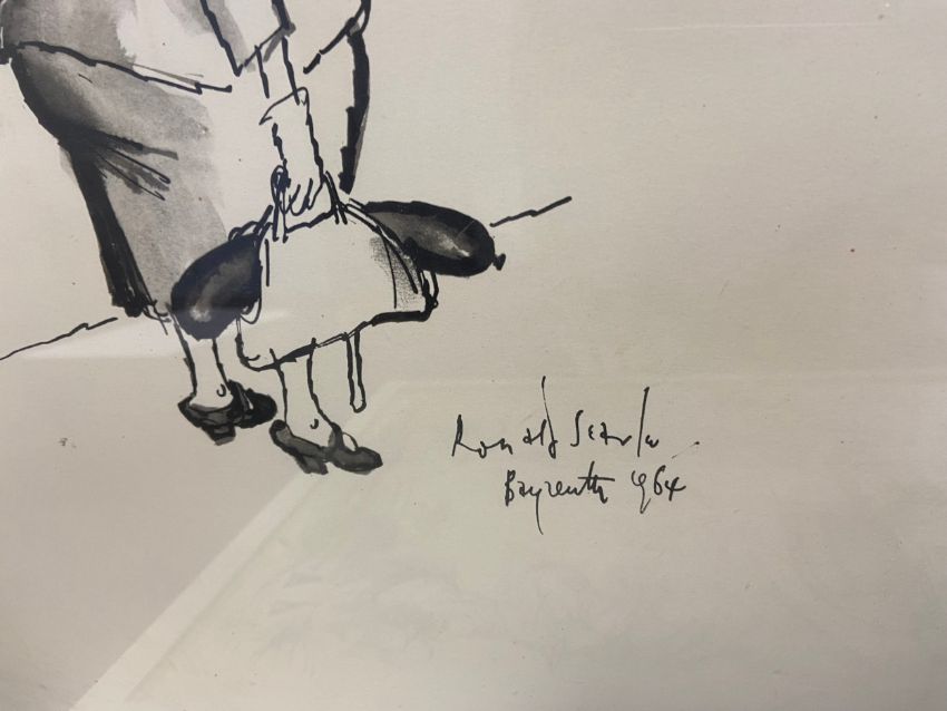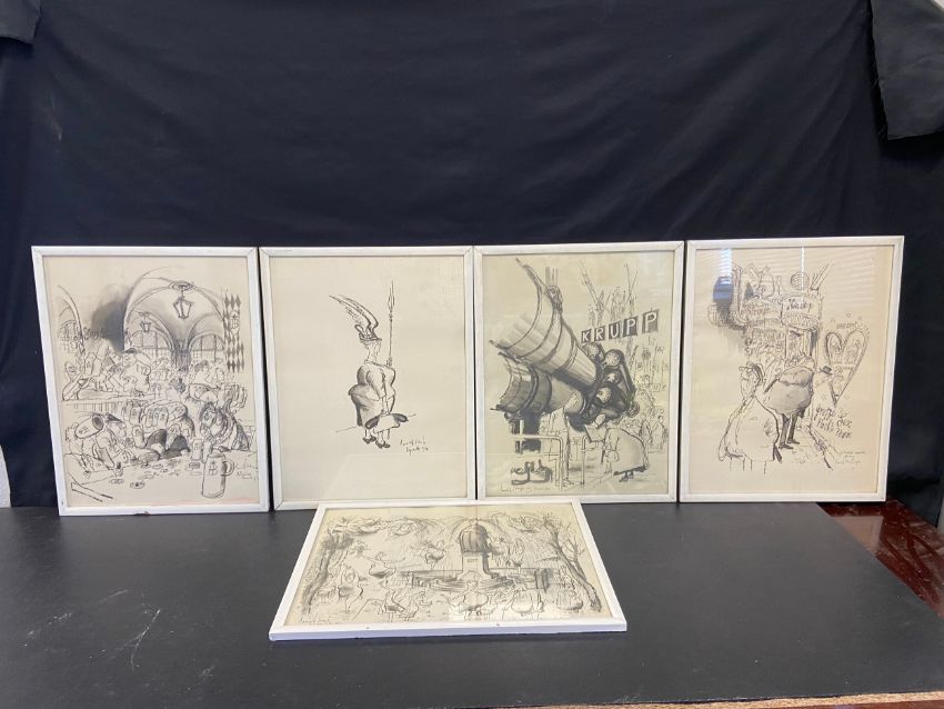 A set of five vintage framed and glazed prints; Ronald Searle cartoons. 41x53cm.