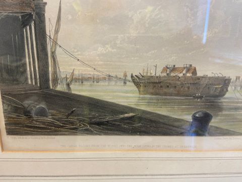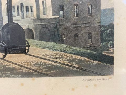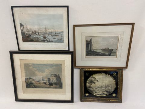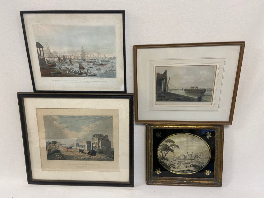 A collection of 18th and 19th century engravings of Greenwich interest along with a Robert Havell aquatint, Manchester and Liverpool Railway. 44x50cm (Largest) (Low cost in-house delivery available).