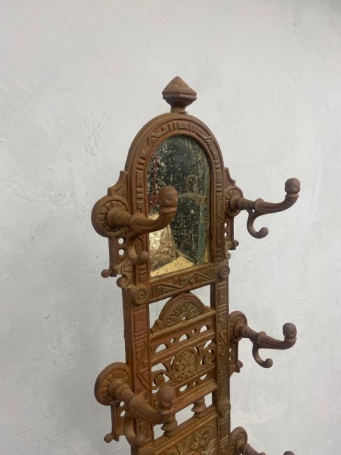 A Victorian cast iron hallstand fitted with mirror and marble shelf with foundry mark to the back. H.172 W.59 cm (At the base).
