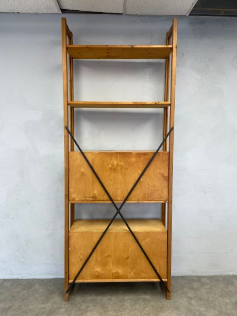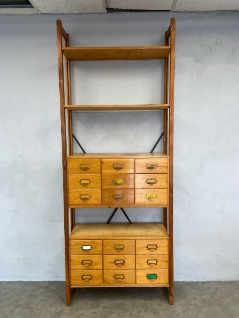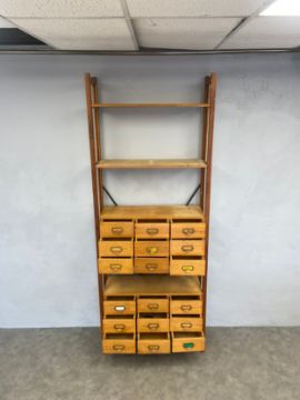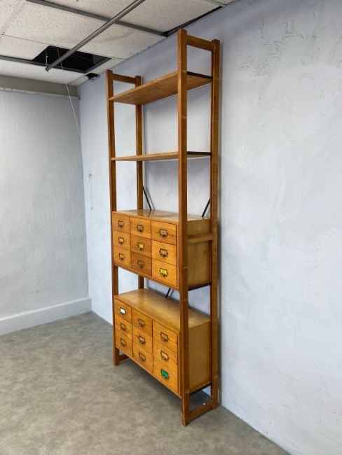 A mid-century Remploy Lundia Prefab Storage System open bookcase fitted with filing cabinet sections. H.243 W.95.D.31cm.