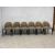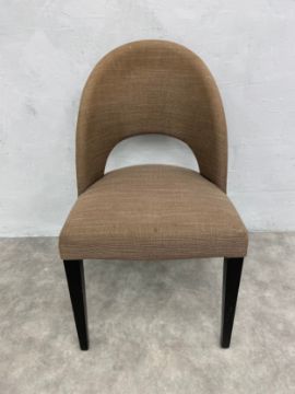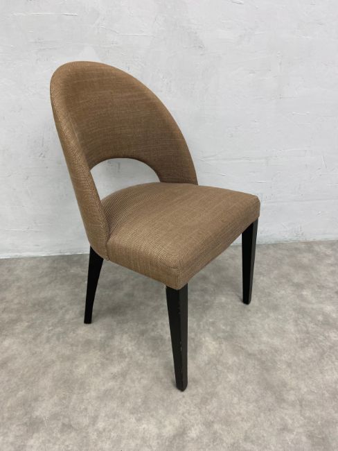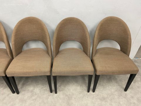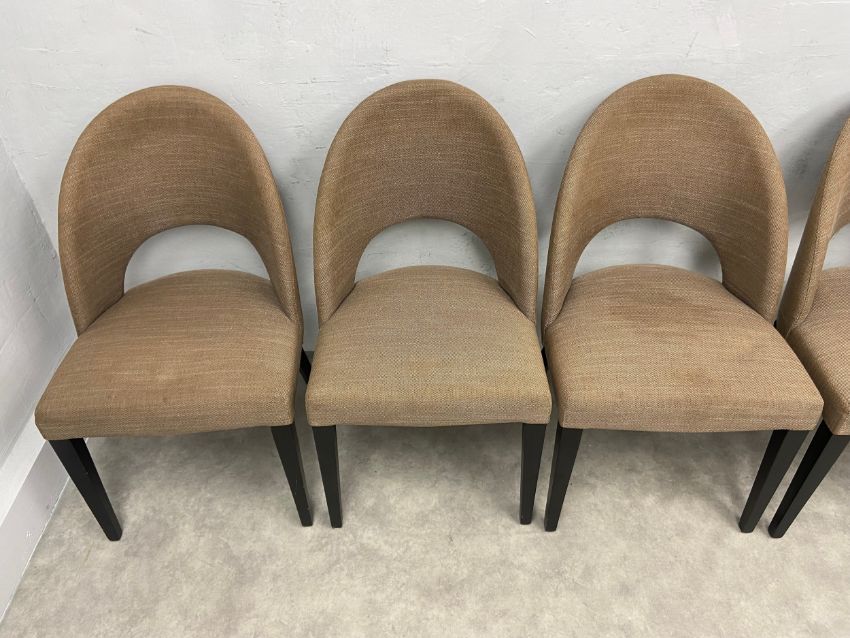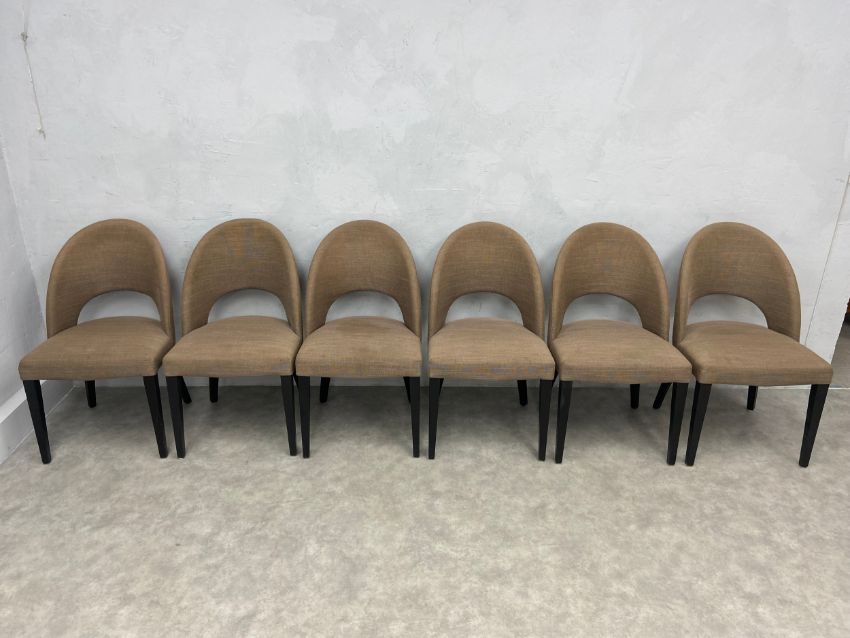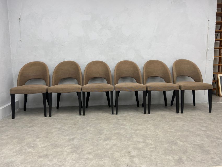 A set of six mid-century design dining chairs upholstered in calico on ebonised supports. H.90cm.