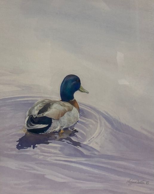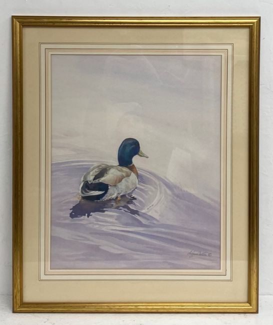 Virginia Austin (Virginia Miller b.1951), a large contemporary watercolour portrait of a duck, signed and dated 1986 to the bottom right in a glazed gilt frame. H.75 W.62cm