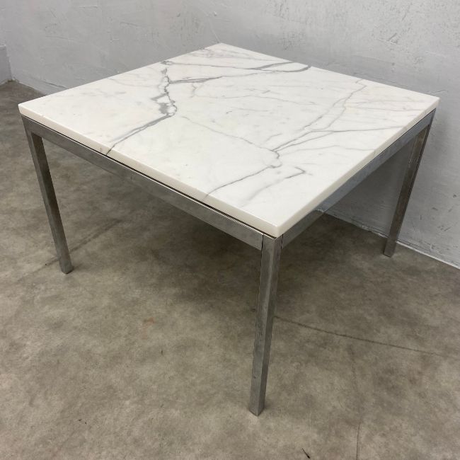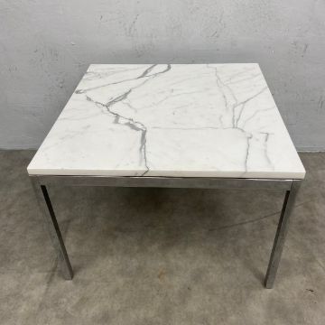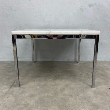 A mid to late 20th century low side or coffee table in the style of Florence Knoll with white marble top raised on straight square tubular chrome supports. H.42 W.60 D.60cm.