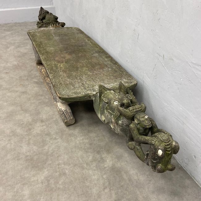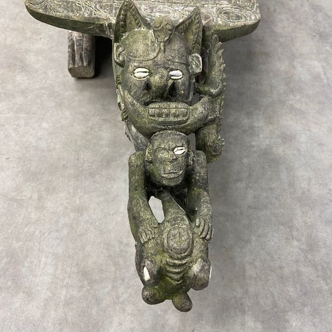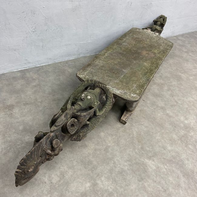 A 20th century African tribal hardwood ceremonial bench of abstract figural form with carved openwork ends inset with cowry shells raised on prone animal leg supports. H.33 W.216 D.44cm.