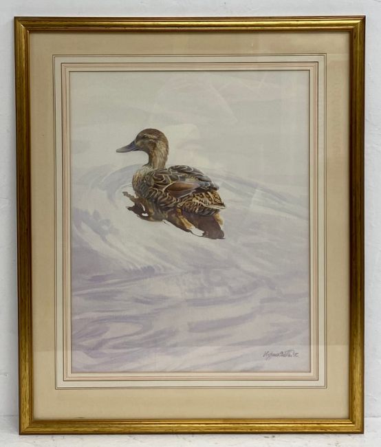Virginia Austin (Virginia Miller b.1951), a large contemporary watercolour portrait of a duck, signed and dated 1986 to the bottom right in a glazed gilt frame. H.75 W.62cm
