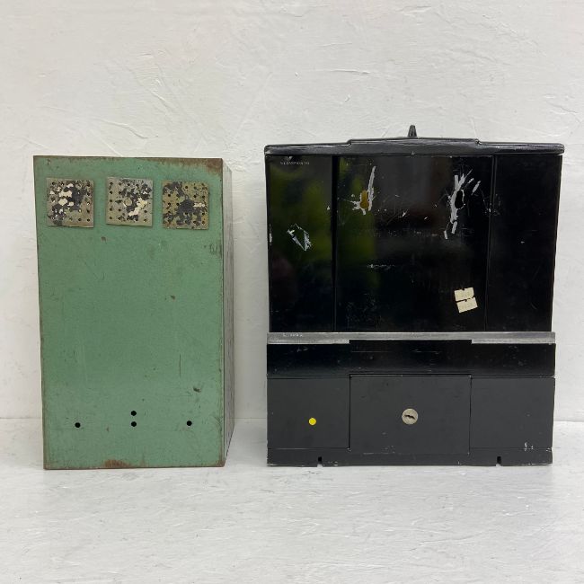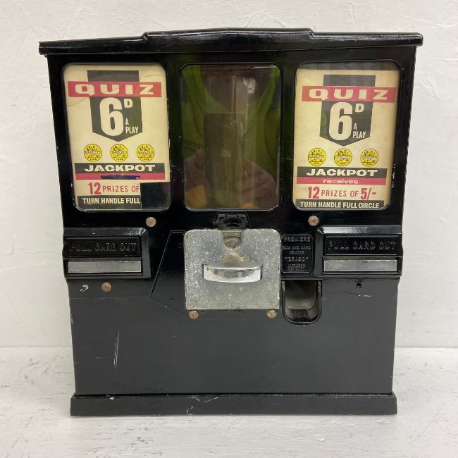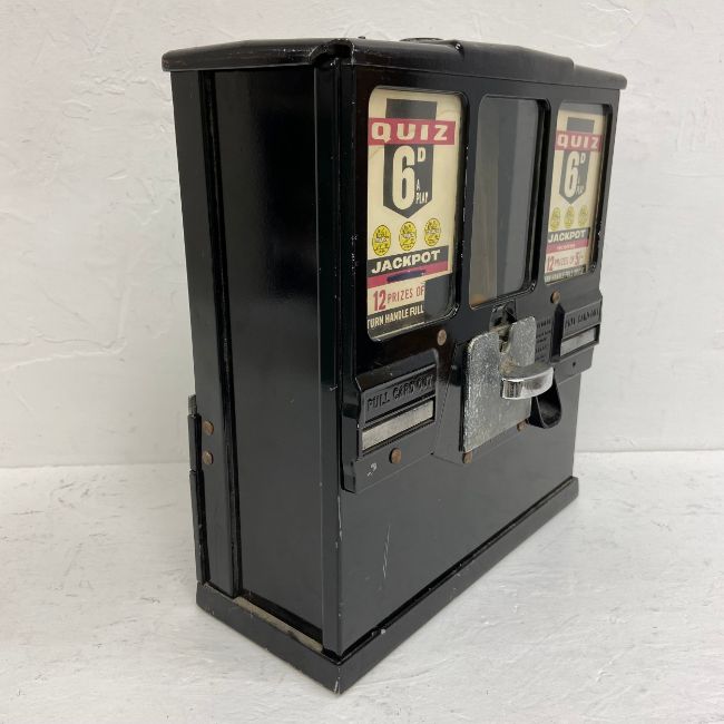 A vintage American Dean Rite Master ball point pen vending machine together with a Quiz gum-ball machine. H.38 W.33cm. (Largest)