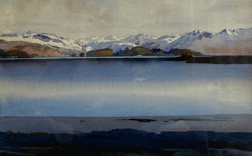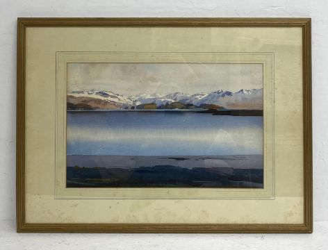 Mary Holden Bird (1900-1978), a large early 20th century watercolour depicting a mountainous lakescape, signed bottom left in a glazed gilt frame. H.55 W.76cm